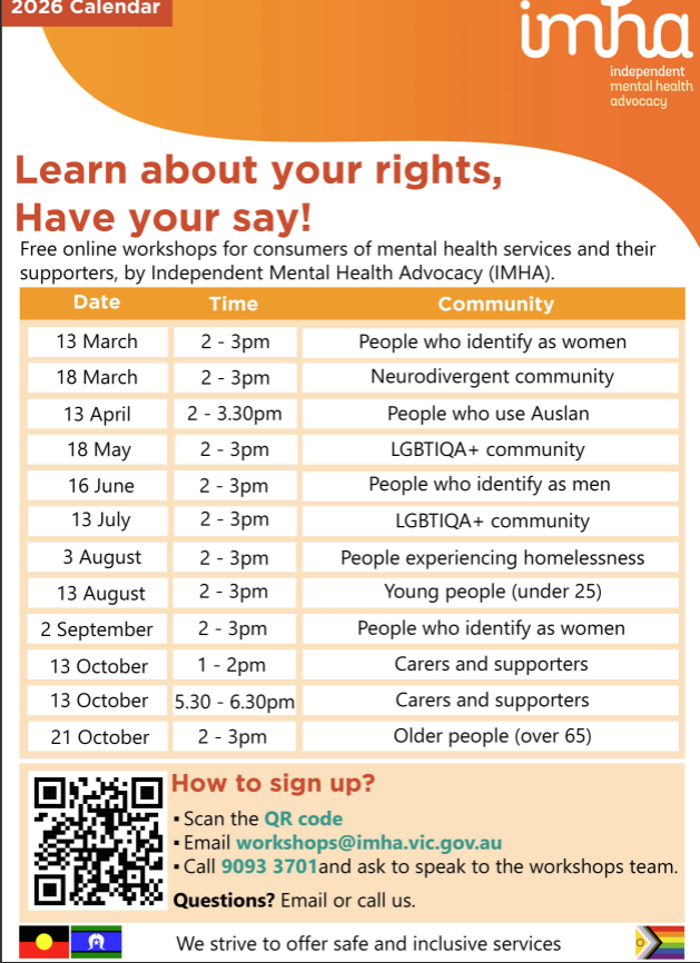 Independent Mental Health Advocacy is delivering free online workshops on Rights and Self-Advocacy for diverse consumers of mental health and wellbeing services and their supporters.