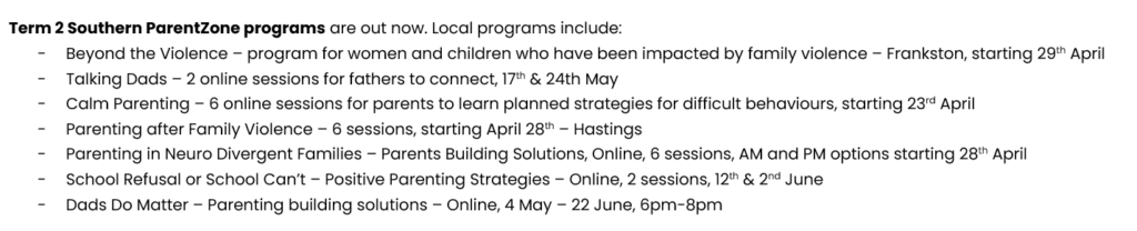 Check these out and more: Southern Parentzone – Term 2, 2026 – Anglicare Victoria